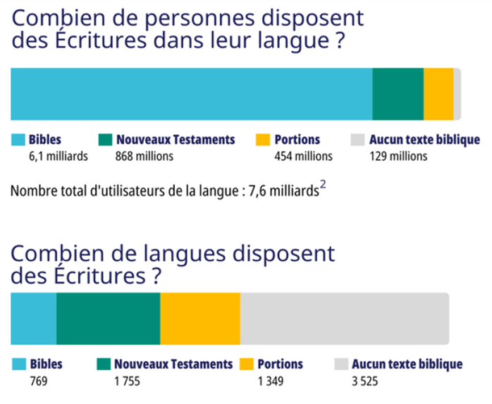 Si l’objectif des Sociétés bibliques s’est clairement rapproché depuis quelques années, beaucoup de travail reste à faire. Environ 1,5 milliard de personnes dans le monde n’ont toujours pas accès à une Bible complète dans leur langue, et 129 millions ne disposent purement et simplement d’aucune traduction, même partielle.