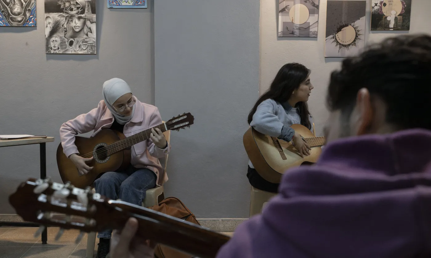 De jeunes Syriens apprennent à jouer de la guitare lors d'un cours organisé au centre communautaire jésuite Beit Alberto Hurtado SJ à Jaramana. Mars 2025